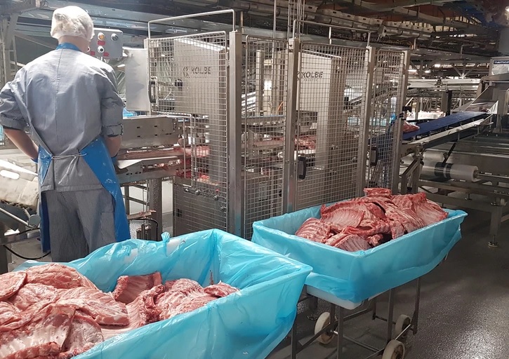Automatisches Schneiden von Rippenplatten, die in 3 oder 2 geteilt werden können: Baby-Rückenrippe, St. Lui und Spareribs. Die Maschine ist voll flexibel, sodass Produktbreiten angepasst werden können, und eine Säge kann einfach deaktiviert werden, wenn nur 1 Schnitt benötigt wird.