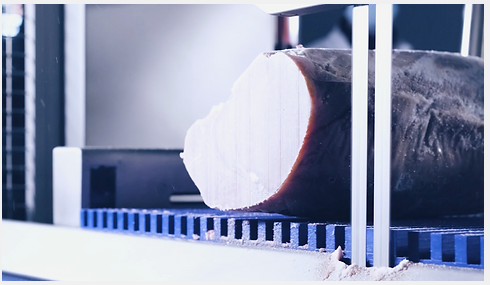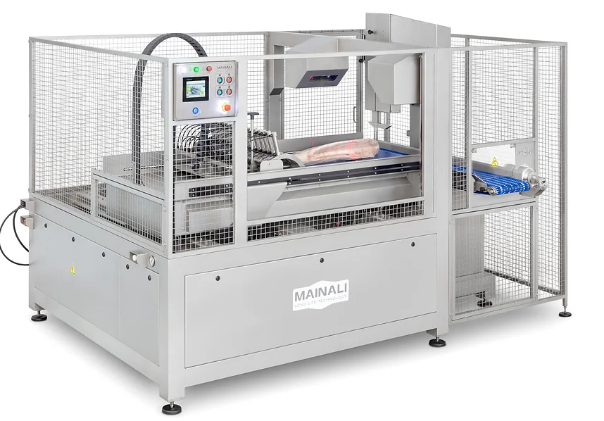 Die Maschine verfügt über mehrere Eingangsparameter, die vorrangig elektronisch gesteuert werden, wie z. B. Gewichtsauswahl, Messbereiche, Schnittgeschwindigkeit, Höhensteuerung, Luftdruck sowie Vor- und Rücklaufbewegung. Sobald die Schneidparameter ausgewählt sind, muss der Bediener nur noch das Produkt laden und die Starttaste drücken. Einfach und effektiv. Die Greifer sind auf das zu schneidende Produkt abgestimmt, was eine maximale Verlustreduzierung ermöglicht. Sobald das Produkt geschnitten ist, wird es über ein Förderband aus der Maschine entnommen. Darüber hinaus ist die Maschine mit unserem QPS-System (Quick Protection System) ausgestattet, um jegliche Gefahr für den Bediener zu vermeiden.